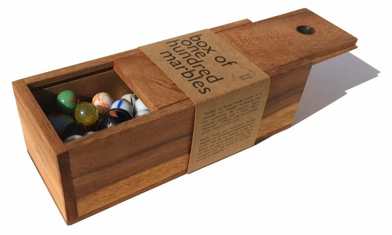 The aim of the game is to fire (thumb-flick) your shooter (larger marble) at other marbles in a bid to knock them out of the playing circle. Any knocked out are scored as yours. In the 1950s, 60s and 70s, kids across Australia often played for keepsies both indoors and out. Our fabulous box of premium glass marbles includes 4x 25mm shooters and 96 x 16mm marbles in a variety of custom designed colourful patterns. Our box with sliding lid is crafted from hardwood. 20cm x 8cm x 6.5cm