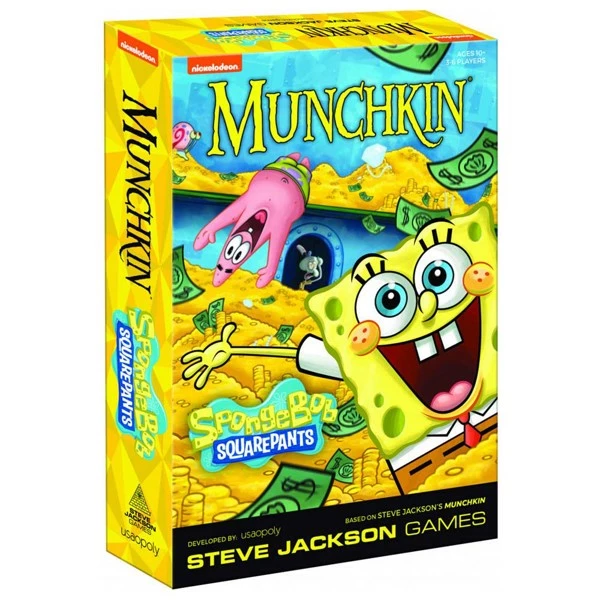 In Munchkin: SpongeBob SquarePants, you can play as your favorite SpongeBob SquarePants character and equip yourself with items such as Krusty Krab Hat and Allies like Gary the Snail to defeat monsters and win an underwater race to Level 10!