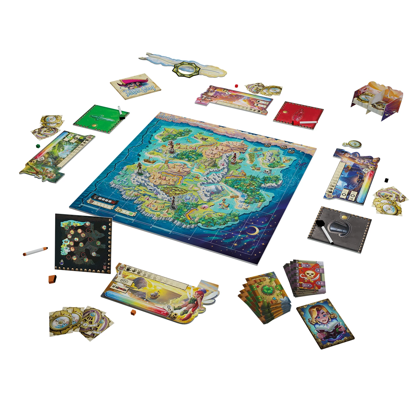Players each choose a character with unique abilities. Then, each player gets the location of a Lost Boy and a pirate. By playing clue cards representing dreams on other players’ boards, you will try to give information about which location to search or avoid on the island. Cards are placed on a scale from very relevant to not relevant at all. The other players can then move to the location they think you meant, in order to find a Lost Boy. The game ends when 5 Lost Boys have found or when pirates show up for the second time. At the end of the game, a die roll determines the layout of the map for further play. Depending on the outcome of the game, players will get more supporting character with more powerful abilities or a more difficult layout for experienced players.