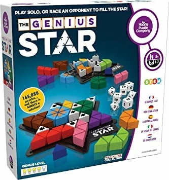 The publisher labels this “more challenging” than The Genius Square, citing 165,888 possible puzzles, 57.4% of which have a golden star solution.